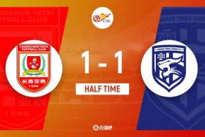 伤停补时5分钟。上半场比赛结束,长春亚泰1-1武汉三镇。